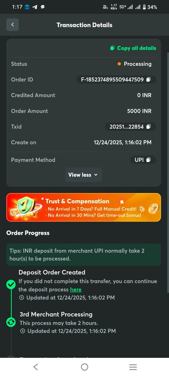 Send your payment De se jyada ho gaya abhi tak mere PC ke bullet mein nahin hua tha red स्टेटस: प्रोसेसिंग ऑर्डर ID: F-1854763973938790043 जमा की गई राशि: 0 INR ऑर्डर राशि: 450 INR Txid: P_260...3EtuH पर बनाएं: 19/01/2026, 22:09:24 -