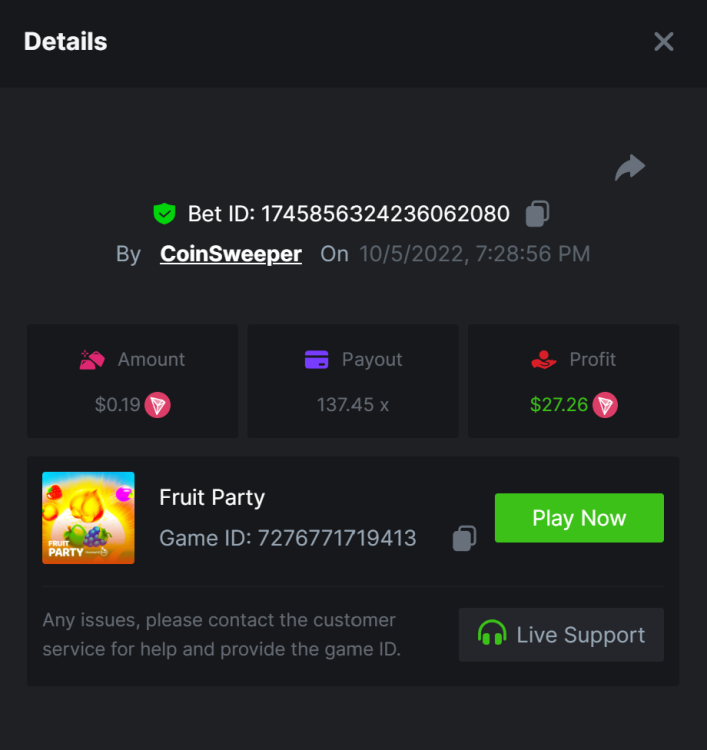 7. hot volcano - https://bc.game/sd/?sd=10SYOIO7ZEO93N - 1513.15x Bet ID: 1743939335900390528 camno de chilli - https://bc.game/sd/?sd=10SYQ0QXTML2QB - 70 x Bet ID: 1743940869443623431 candy 100x - https://bc.game/sd/?sd=10SYQGYJ50T3BN Bet ID: 1743941303908381191 Wolf Hiding - Bet ID: 1743934738919953597 - 500.20x https://bc.game/sd/?sd=10SY237RTTWDfN