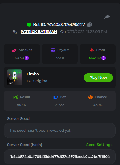 1. don't know how i can get the url for these bets but they are in my transaction history. https://hash.game/sd/?sd=10Q525VMSYVSWJ