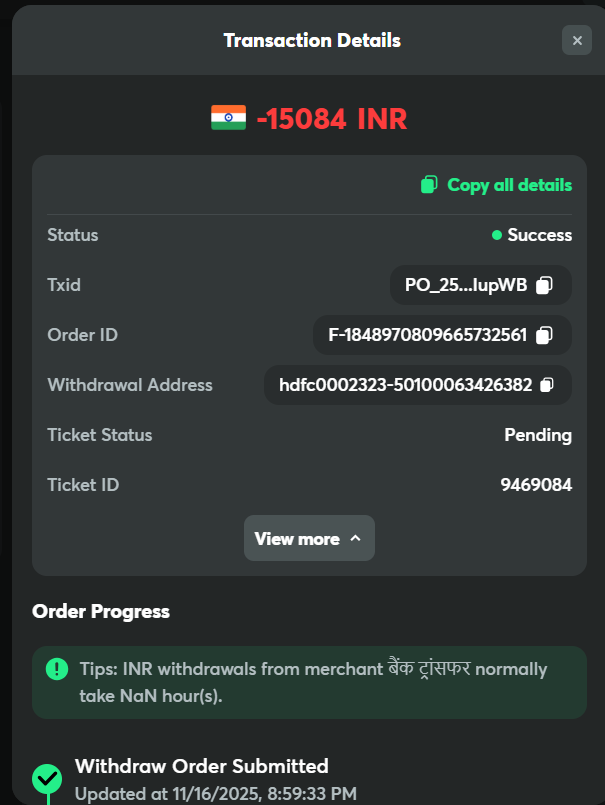 This is my withdrawal request ( order ID F-1848970809665732561 placed on 16.11.2025, and on 17.11.2025, I got a notification stating that the withdrawal was processed, but I have not received money in my bank account. I have raised the ticket (9469084) and received a message stating that it is being processed as per the confirmation from the merchant. Now it's been I have been following up with customer service without any positive response from them. I have shared the bank statement as well to check.