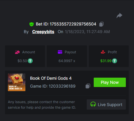 6. -- Just to keep track -- Wild Bounty Showdown - 945.7x Candy Bonanza - 102.4x Leprechaun Riches - 98.75x Spirited Wonders - 68.35x Butterfly Blossom - 135.44x Supermarket Spree - 152.25x Wild Bandito - 207.2x Destiny of Sun and Moon - 111.4x Prosperity Fortune Tree - 210.15x Legendary Monkey King - 84.6x -- -- -- -- -- -- -- -- -- -- -- -- https://bc.game/#/sd/111MI4BCN45A8J https://bc.game/#/sd/1118N98VQ6YOLV https://bc.game/#/sd/111FLN8H2KMUXF https://bc.game/#/sd/1117ZLODNLU13N https://bc.game/#/sd/111ASNM3GZTLOZ https://bc.game/#/sd/111E79UVO7INMB https://bc.game/#/sd/111D534T8YKE1F https://bc.game/#/sd/111ECYHMTQN09F https://bc.game/#/sd/111LTQM7BZ1TEB https://bc.game/#/sd/111D33QIXPOU1F BOUNTY
