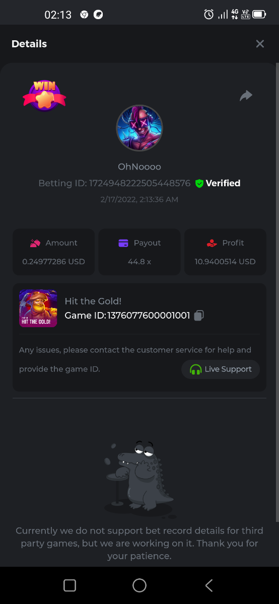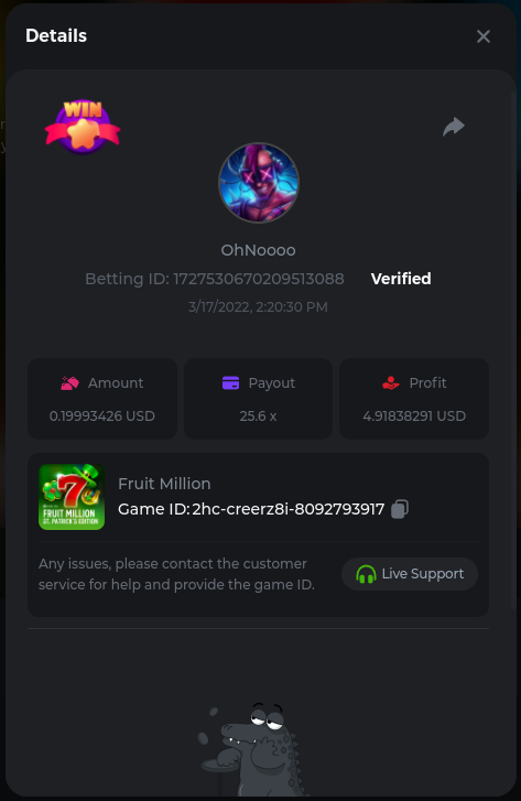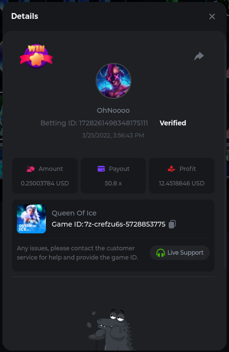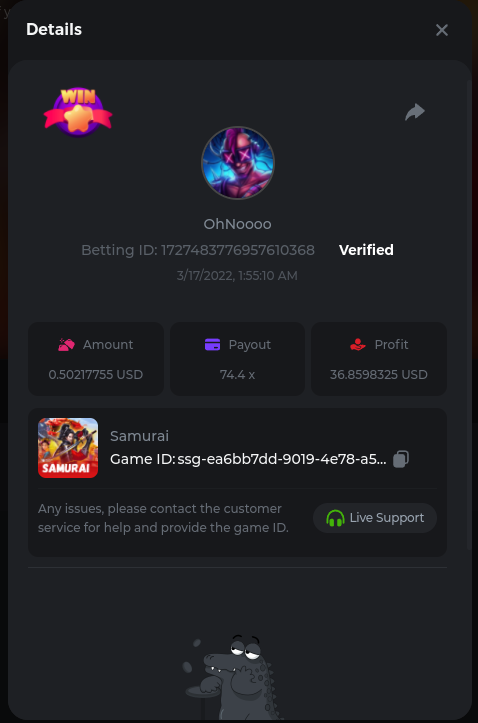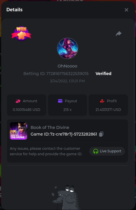 Golden Dancing Lion x 177.2 Betting ID: 1724947781266571904 Hit the Gold! x 44.8 Betting ID: 1724948222505448576 Tiger Jungle x 93 Betting ID: 1725143498319811079 Solar Queen x 47 Betting ID: 1725006049288958592