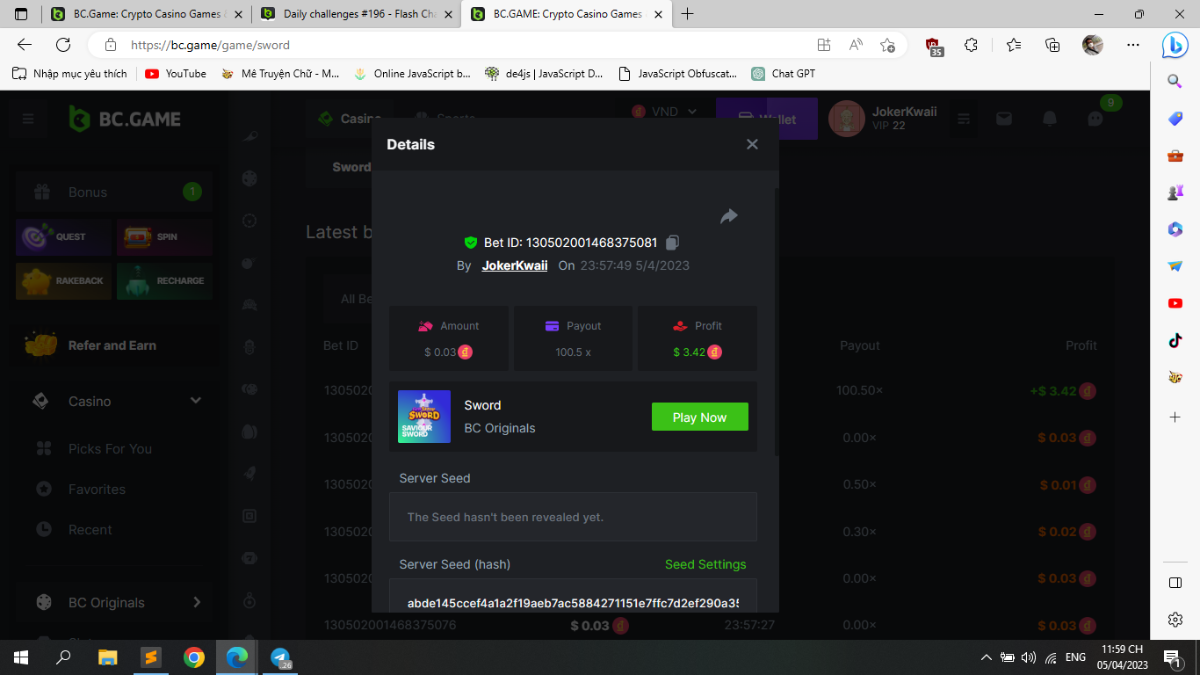 Maksypro Posted April 5, 2023 Share Posted April 5, 2023 ย Read Carefully Before Start To Hunt ย Daily Challenges #196 SWORD Hunt : Win the highest multiplier Min Multiplier requirement 50x Min Level 4 ๏ธDuration Starting : Now End time : 23.59 UTC Time How to Join? Make screenshot + paste your bet link + UID or Profile link Any coin, with min bet 0.01 USD is allowed (jb/bb/bcl not allowed) Reward Prizes 1st Place........$7 BCD 2nd Place.....$5 BCD 3rd Place.....$4 BCD 4th Place.....$3 BCD 5th Place.....$2 BCD ๐ต Winners will be announcing next day after Roll Point! Link to comment Share on other sites More sharing options...