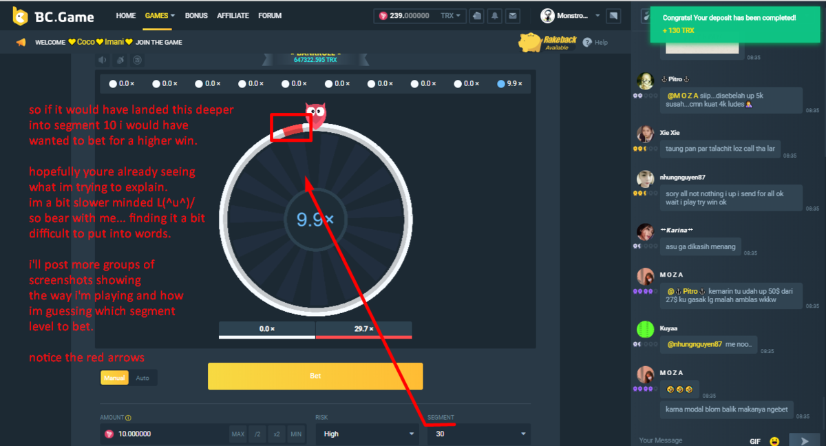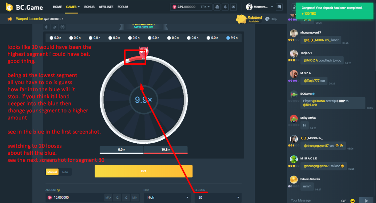 i started off playing this game on low risk and now i play it only on high risk. why? because i'm now only having to guess how deep into the segment is it going to stop when i hit my win. this changes the need to raise your bet to catch profit. instead i just change the segment to a higher number if i want a higher payout. and a lower segment if i sense its going to stop before the segment i'm currently betting for.  After a win or two i'll go back to minimum bet to race through the expected loss streaks and when i sense if its going to hit i'll raise my bet and then i'll contemplate if it will be a shallow 10 (stopping in the first half of the blue) or a deeper 10 (stopping past half way into the blue) if i decide its going to stop deeper, i will change to a higher segment.