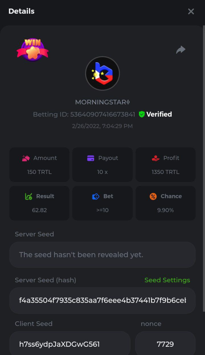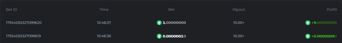 bassabar Posted February 26, 2022 Share Posted February 26, 2022 (edited) 1st bet: 0.0000001 trtl 2nd bet: 1 trtl Total points (1/0.0000001)*100= 1000000000 points 1st bet (10x): https://bc.game/sd/?sd=10F721097E4AVN 2nd bet (10x): https://bc.game/sd/?sd=10F722AXQSEEQB Edited February 26, 2022 by bassabar Link to comment Share on other sites More sharing options...